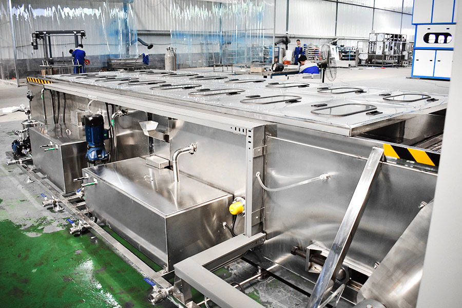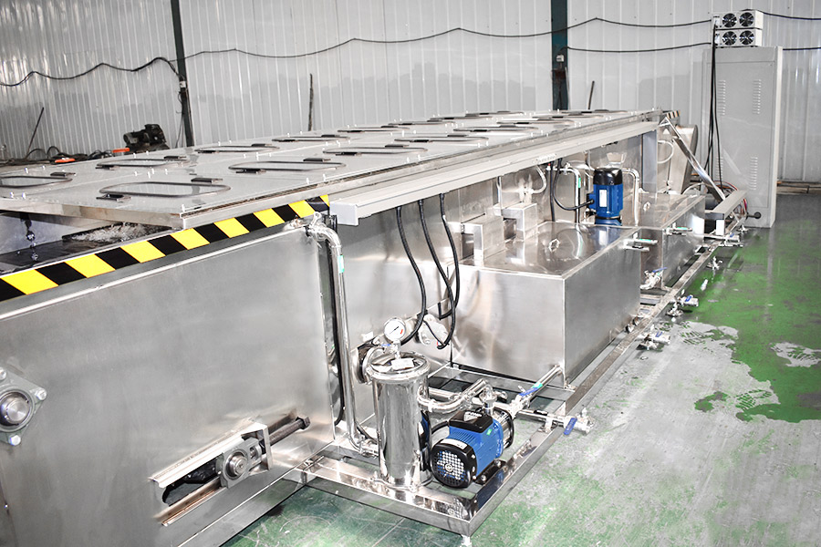 該設備有上下料網帶、超聲波清洗工位、噴淋漂洗工位、高壓風切、熱風烘干工位、溫控水加熱系統、風機、溫控空氣加熱系統、移動式風刀、PLC+觸摸屏控制系統、管路系統及智能電器控制系統等組成。自動進排液和自動加溫系統完全實現了無人干預,自動運行,很大程度上降低了工人的勞動強度。先進的霧氣處理系統可以將清洗時產生的霧氣冷凝回流,空氣經過濾和活性炭吸附后排出。