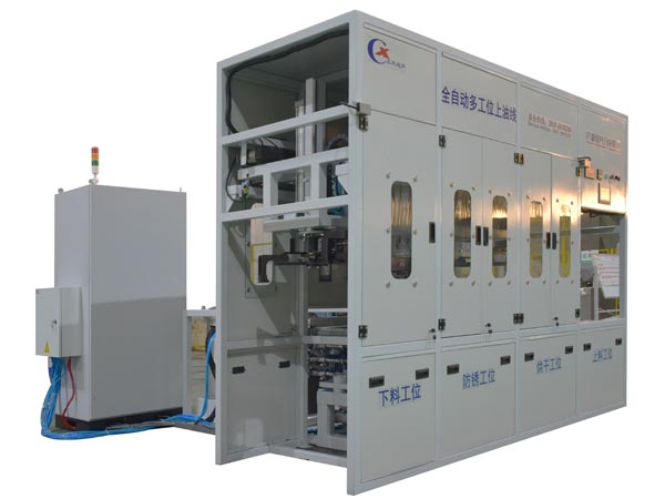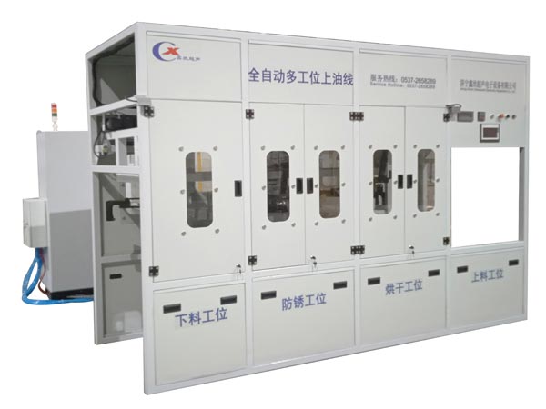 該設(shè)備為自動防銹烘干機(jī),采用高壓熱風(fēng)循環(huán)干燥+霧化噴淋工藝,整機(jī)采用多臂機(jī)械手傳動機(jī)構(gòu),PLC+ 觸摸屏控制。該設(shè)備共4個(gè)工位:上料工位、高壓熱風(fēng)烘干工位、霧 化噴淋防銹工位、下料 工位。該設(shè)備還包含循環(huán)過濾裝置等。該機(jī)結(jié)構(gòu)設(shè)計(jì)及工藝安排合理、自動化程度高、上油精度高, 有效解決了此類工件的上油難題.