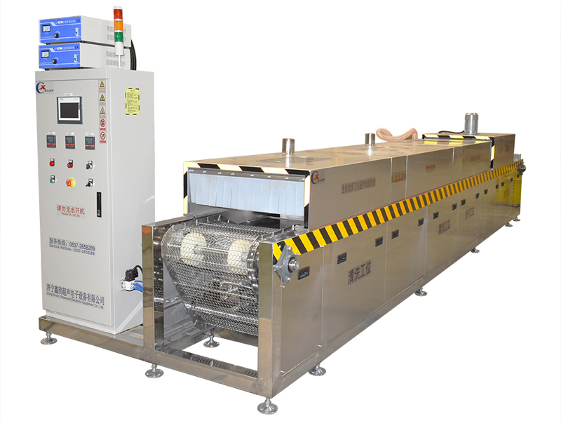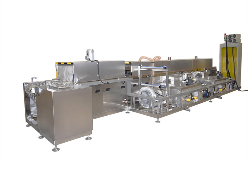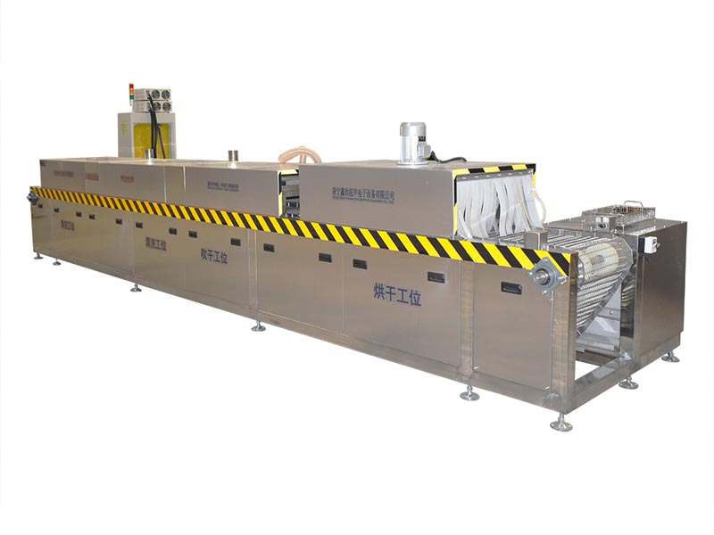 該設(shè)備有上下料網(wǎng)帶、超聲波清洗工位、超聲波漂洗工位、高壓風(fēng)切、熱風(fēng)烘干工位、溫控水加熱系統(tǒng)、風(fēng)機(jī)、溫控空氣加熱系統(tǒng)、移動(dòng)式風(fēng)刀、PLC+觸摸屏控制系統(tǒng)、管路系統(tǒng)及智能電器控制系統(tǒng)等組成。自動(dòng)進(jìn)排液和自動(dòng)加溫系統(tǒng)完全實(shí)現(xiàn)了無人干預(yù),自動(dòng)運(yùn)行,很大程度上降低了工人的勞動(dòng)強(qiáng)度。先進(jìn)的霧氣處理系統(tǒng)可以將清洗時(shí)產(chǎn)生的霧氣冷凝回流,空氣經(jīng)過濾和活性炭吸附后排出。